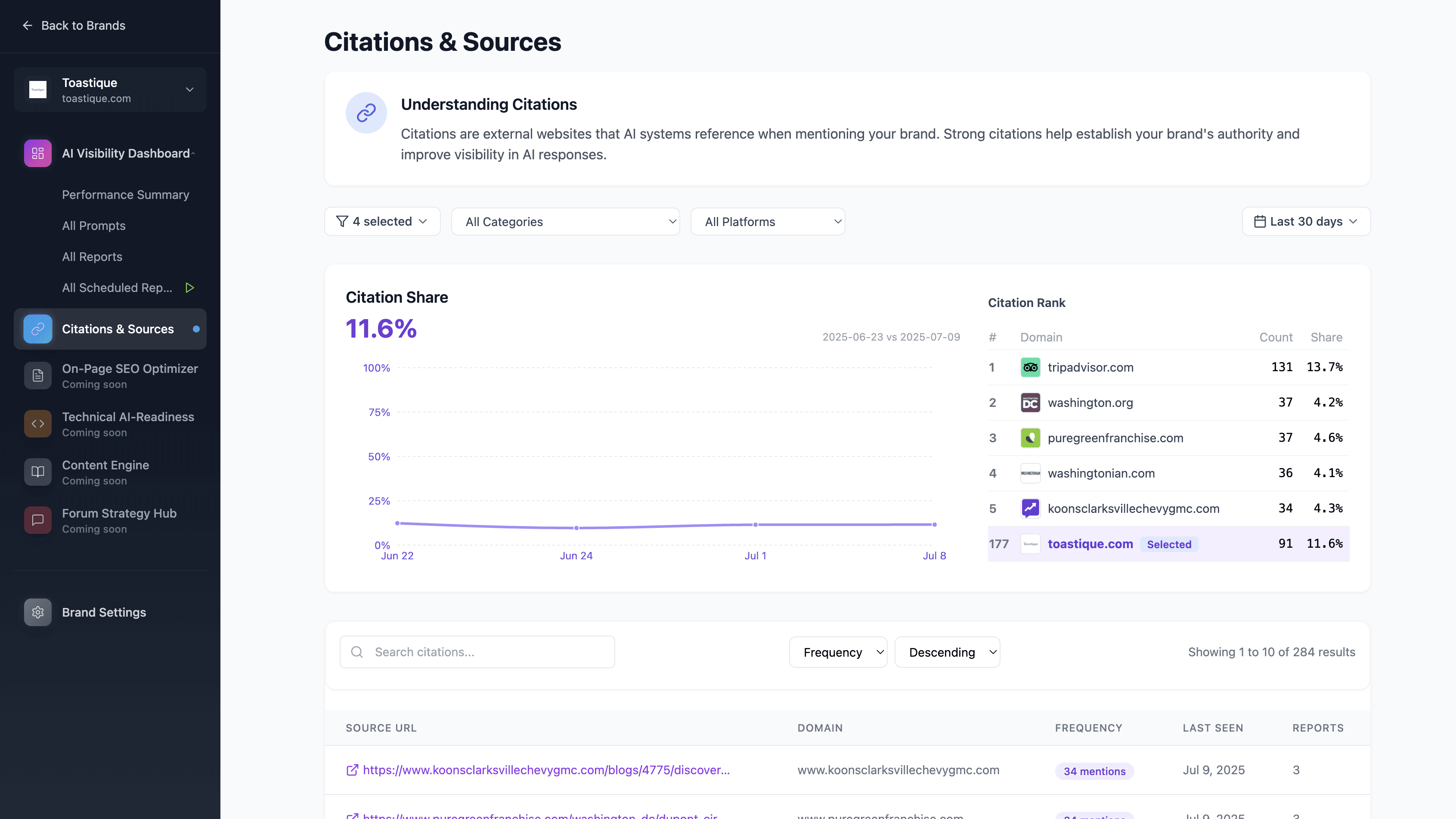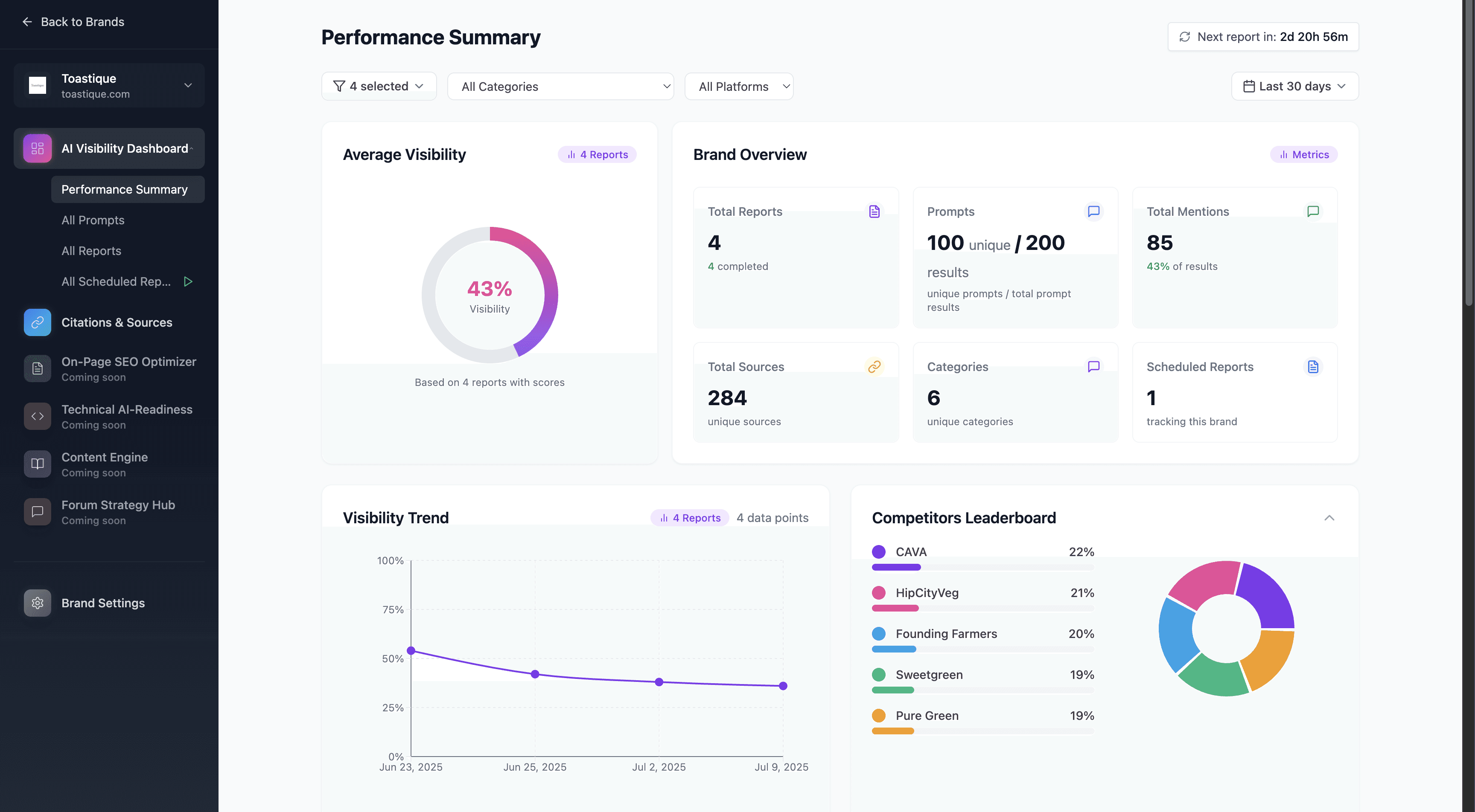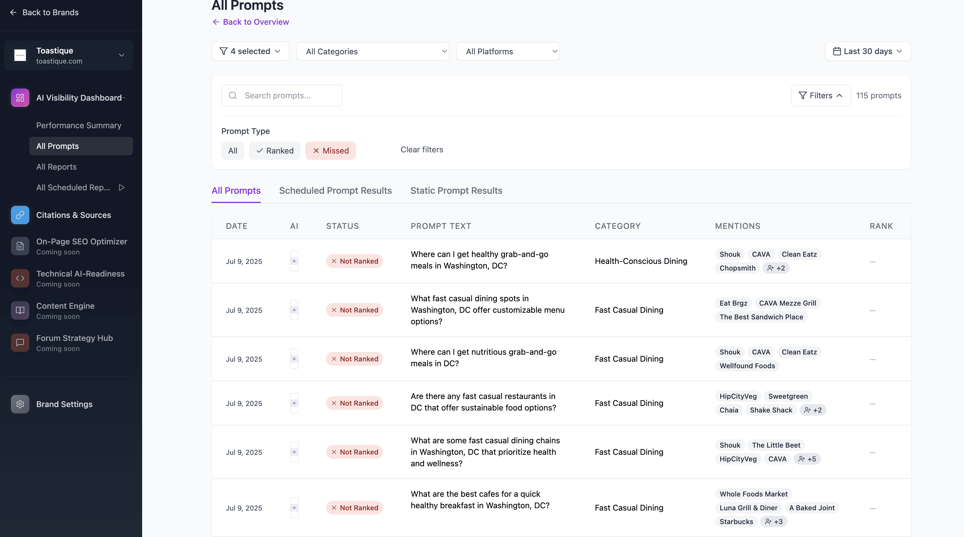 Once you create your first report, you’ll be able to navigate and filter your results, see your competitors, sources, and citations, missed prompts vs ranked prompts, and an AI Platform Matrix.
