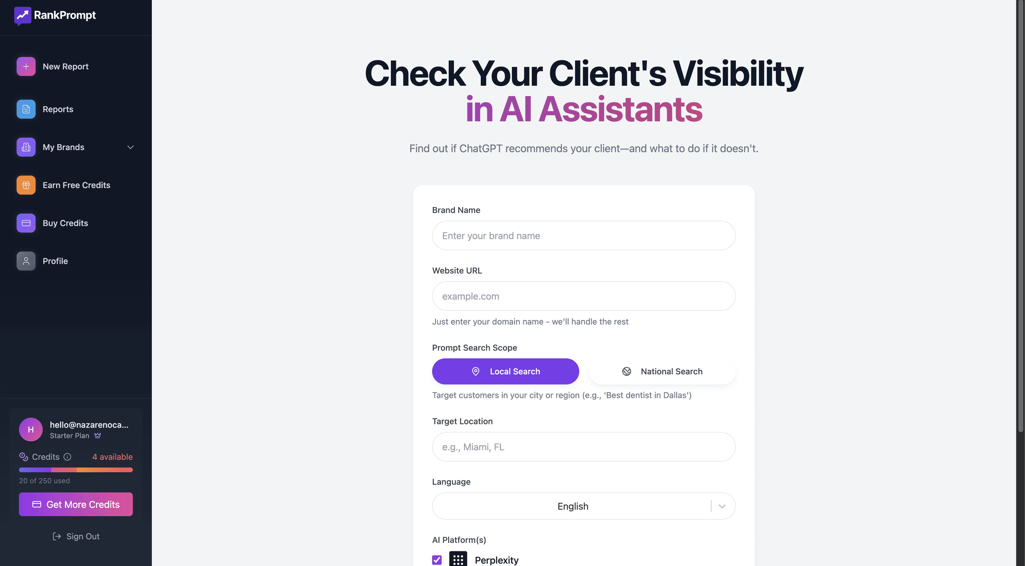 Create Your First Report (Your Core Visibility Engine)Reports are the foundation of RankPrompt.
