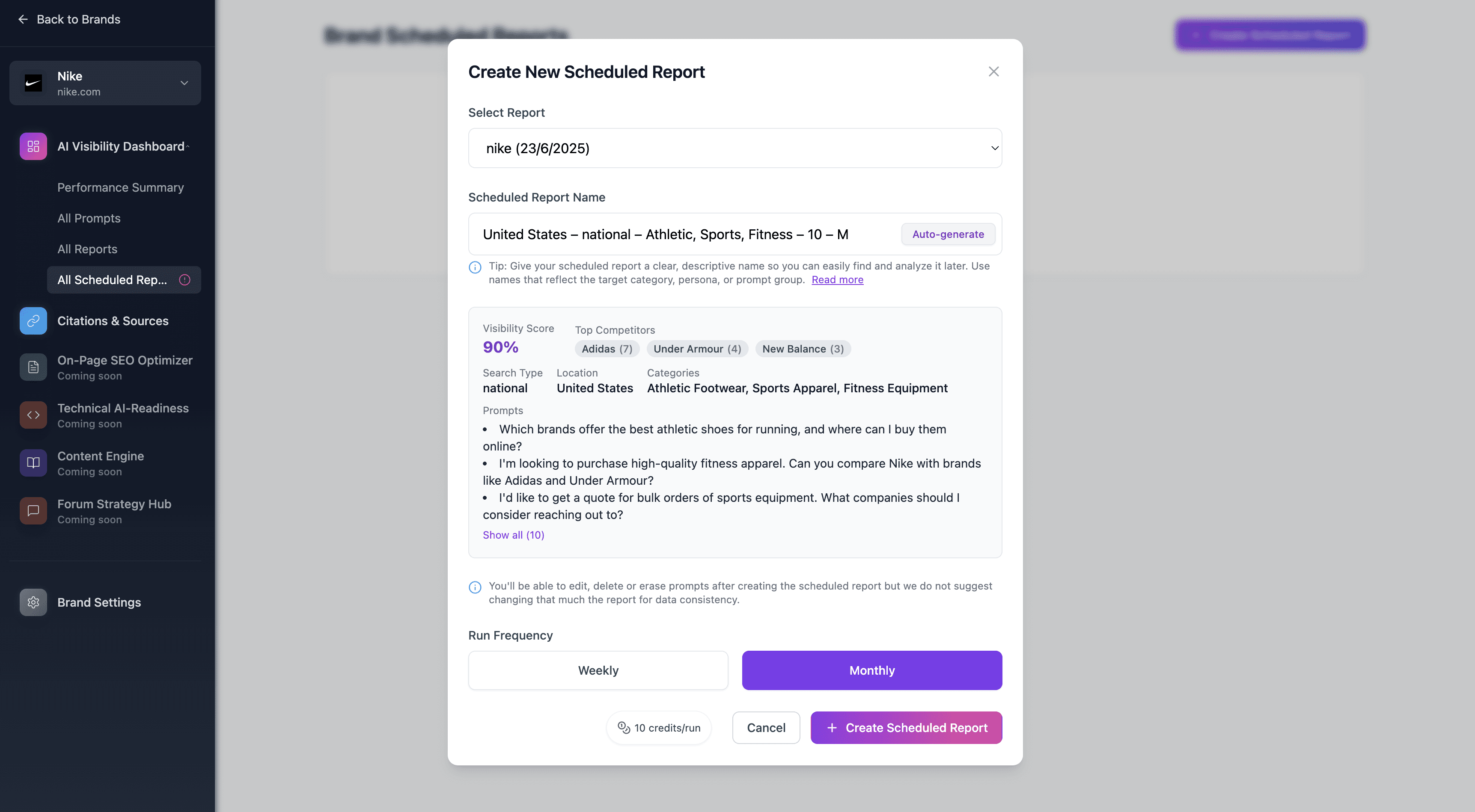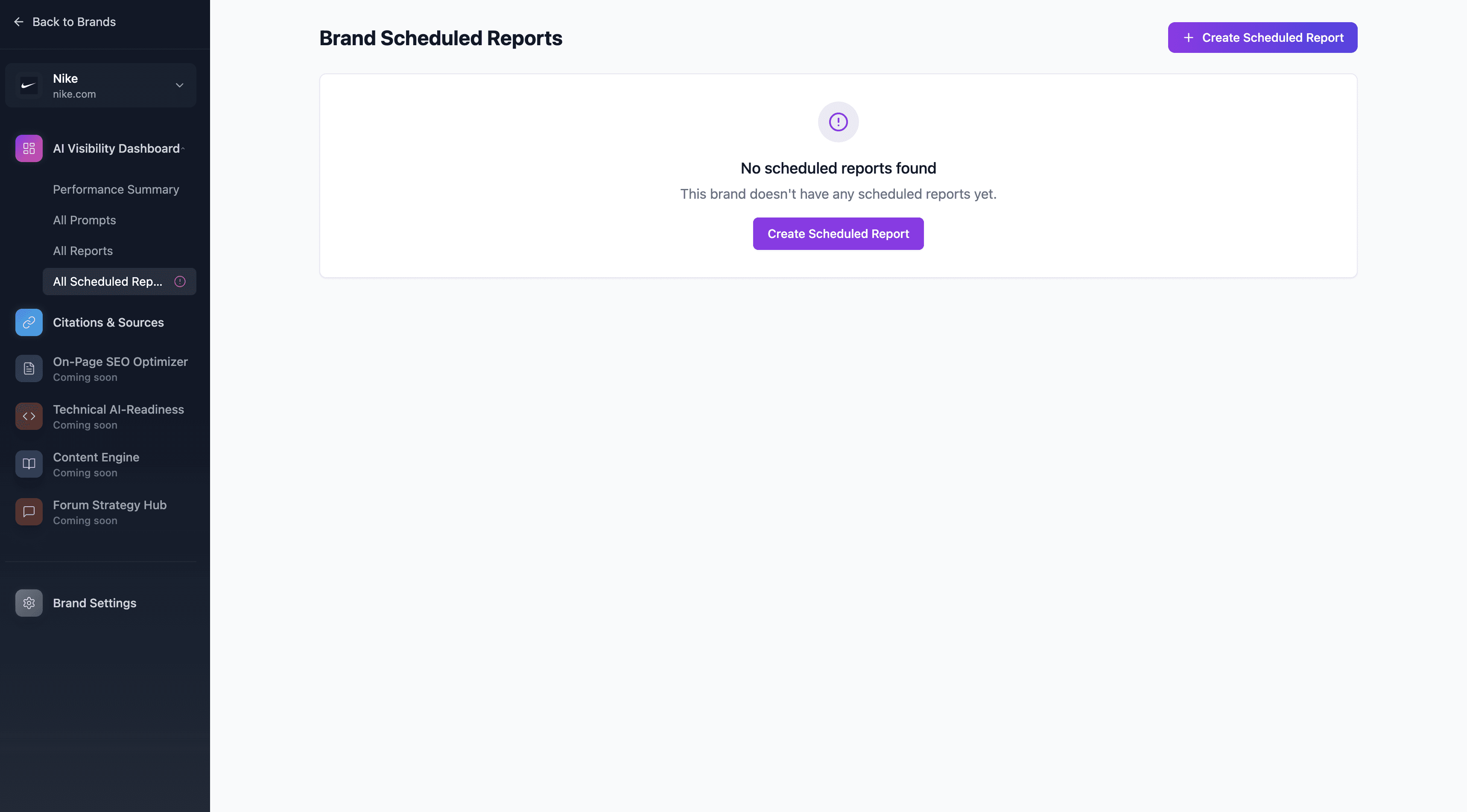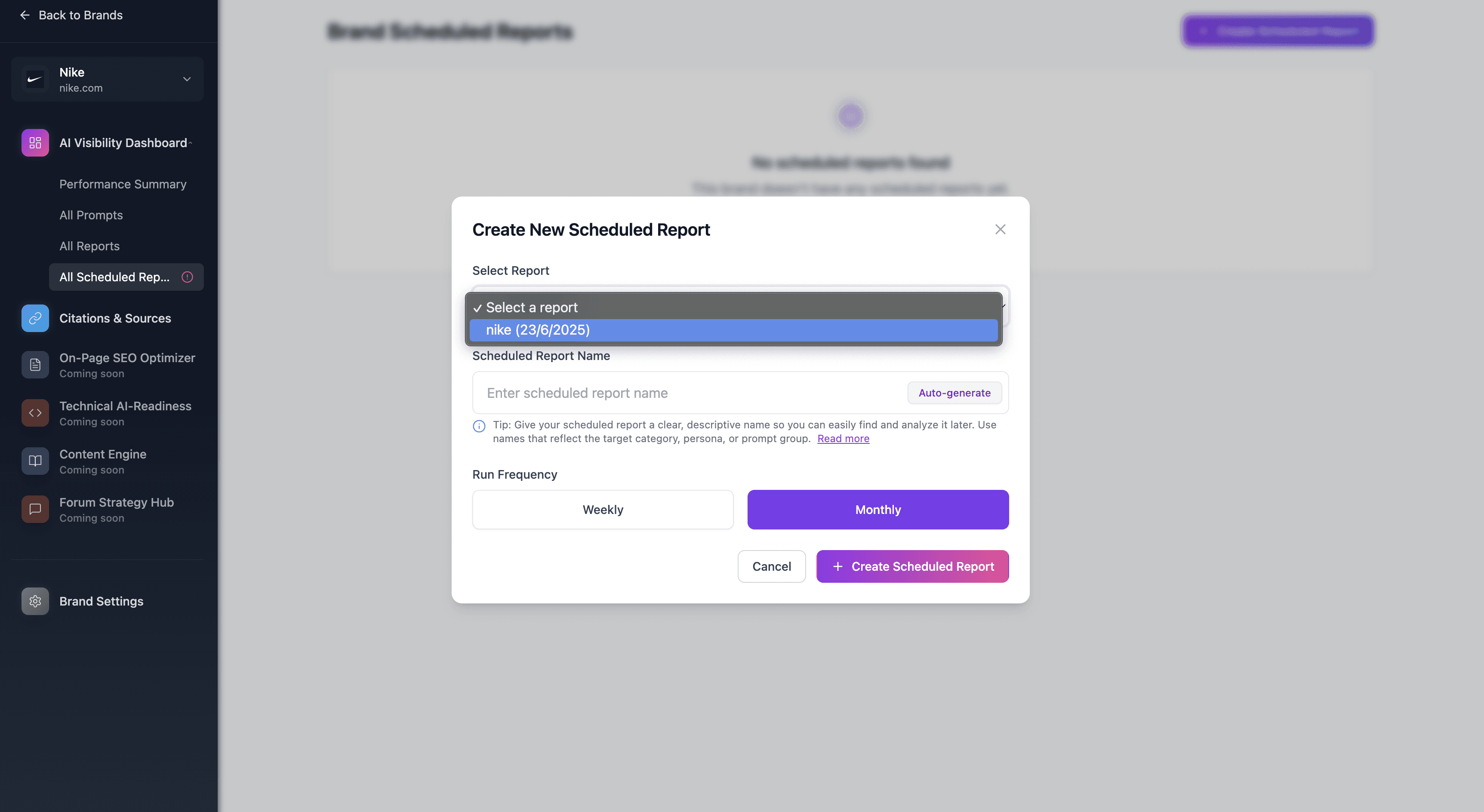 Schedule Reports (Automate Tracking Over Time)Inside your Brand Dashboard, you can easily create Scheduled Reports: