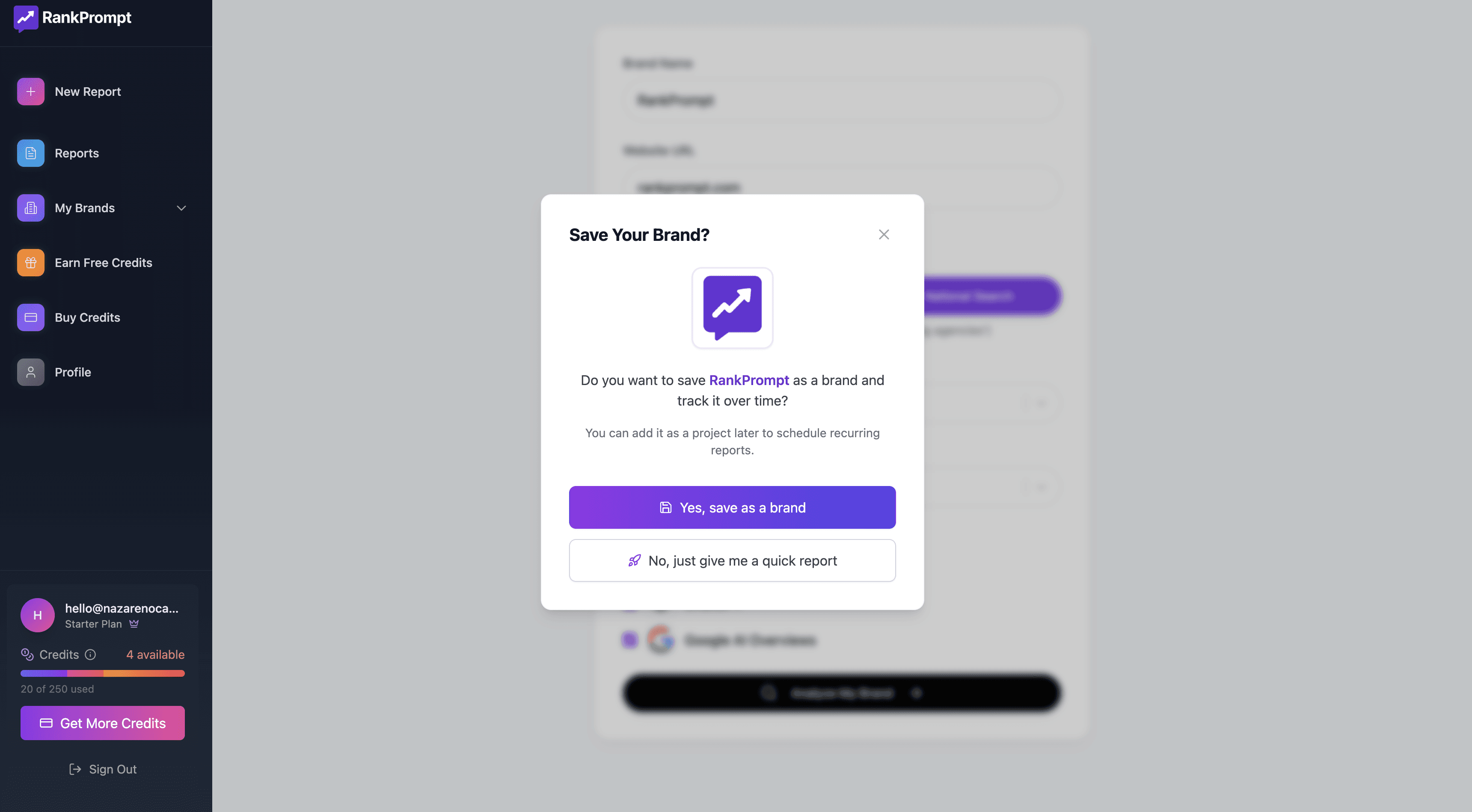 Create Your First Brand (Your Hub for Tracking)After you initiate your first report, you’ll be prompted to create a Brand Profile.