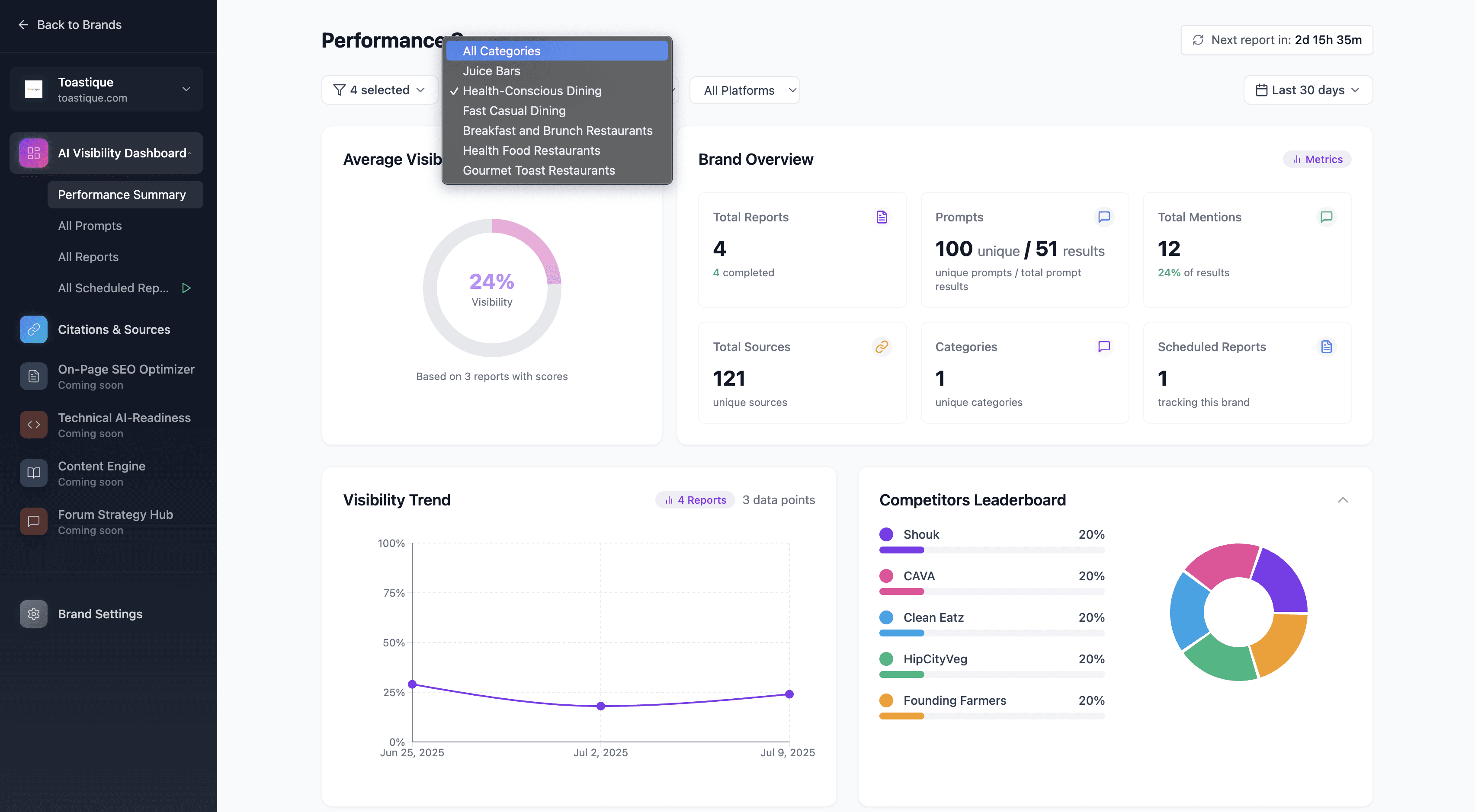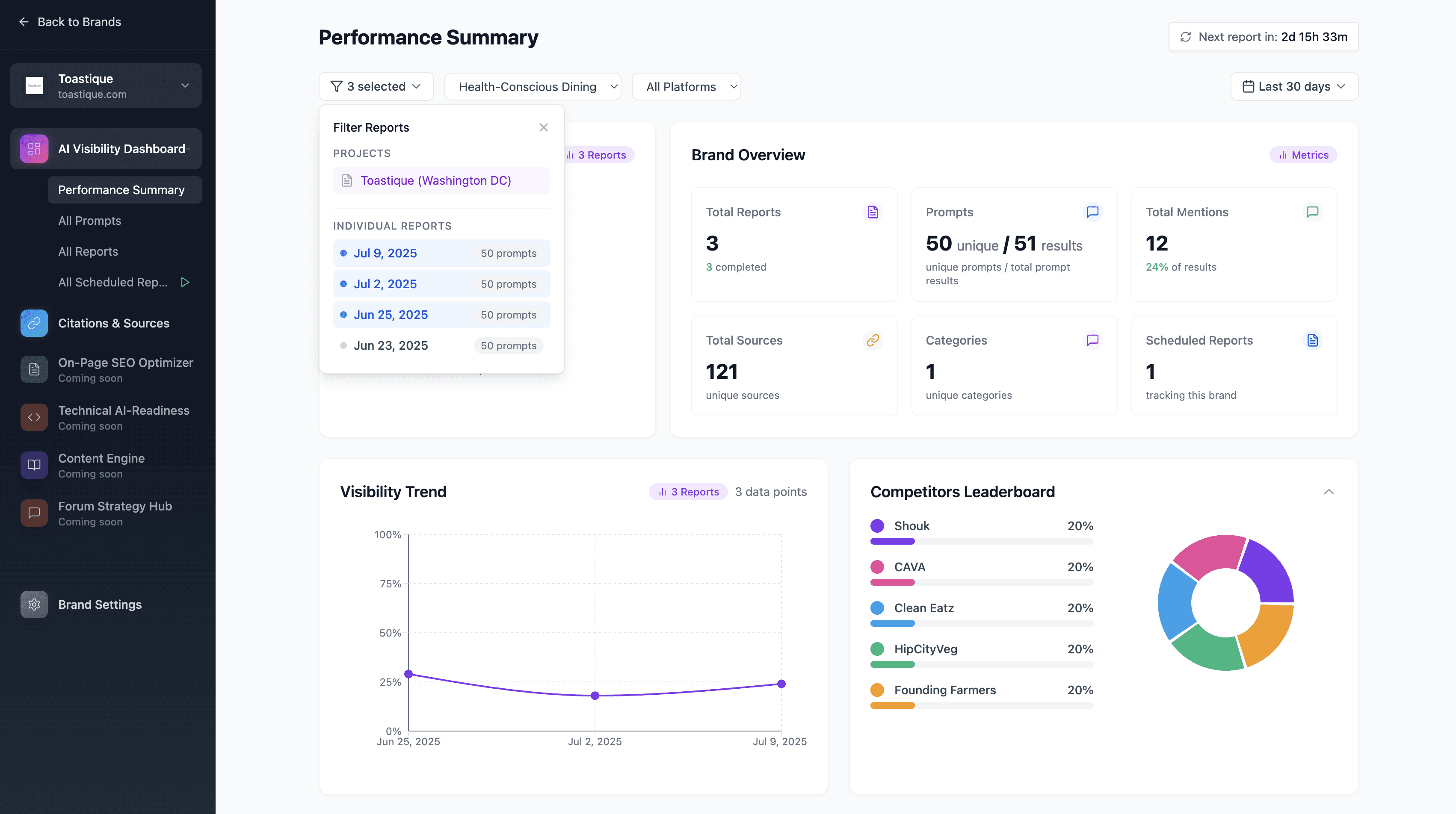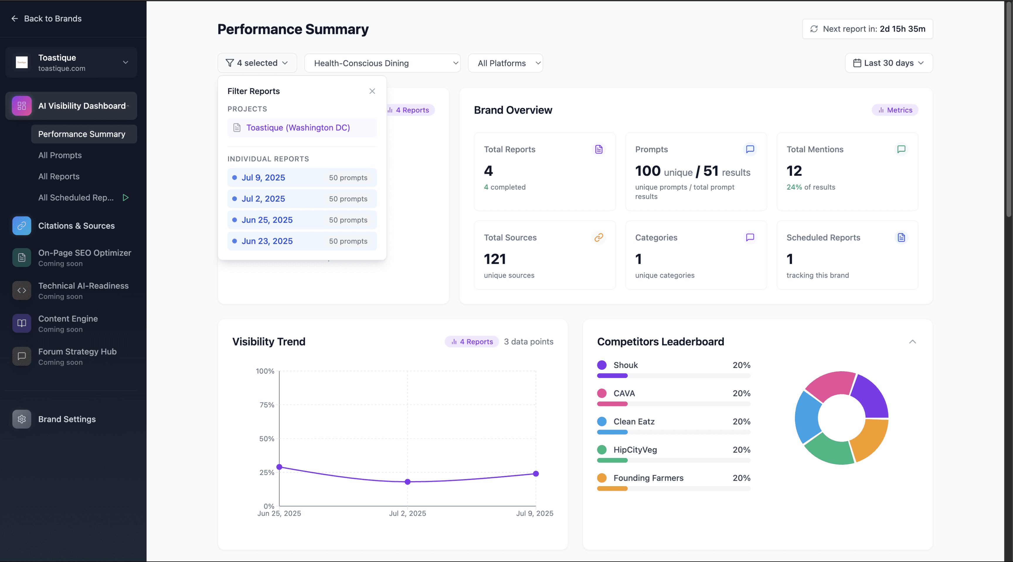 Your Brand Dashboard is the central hub where all your visibility tracking, reports, and analysis come together — fully organized, fully accessible.