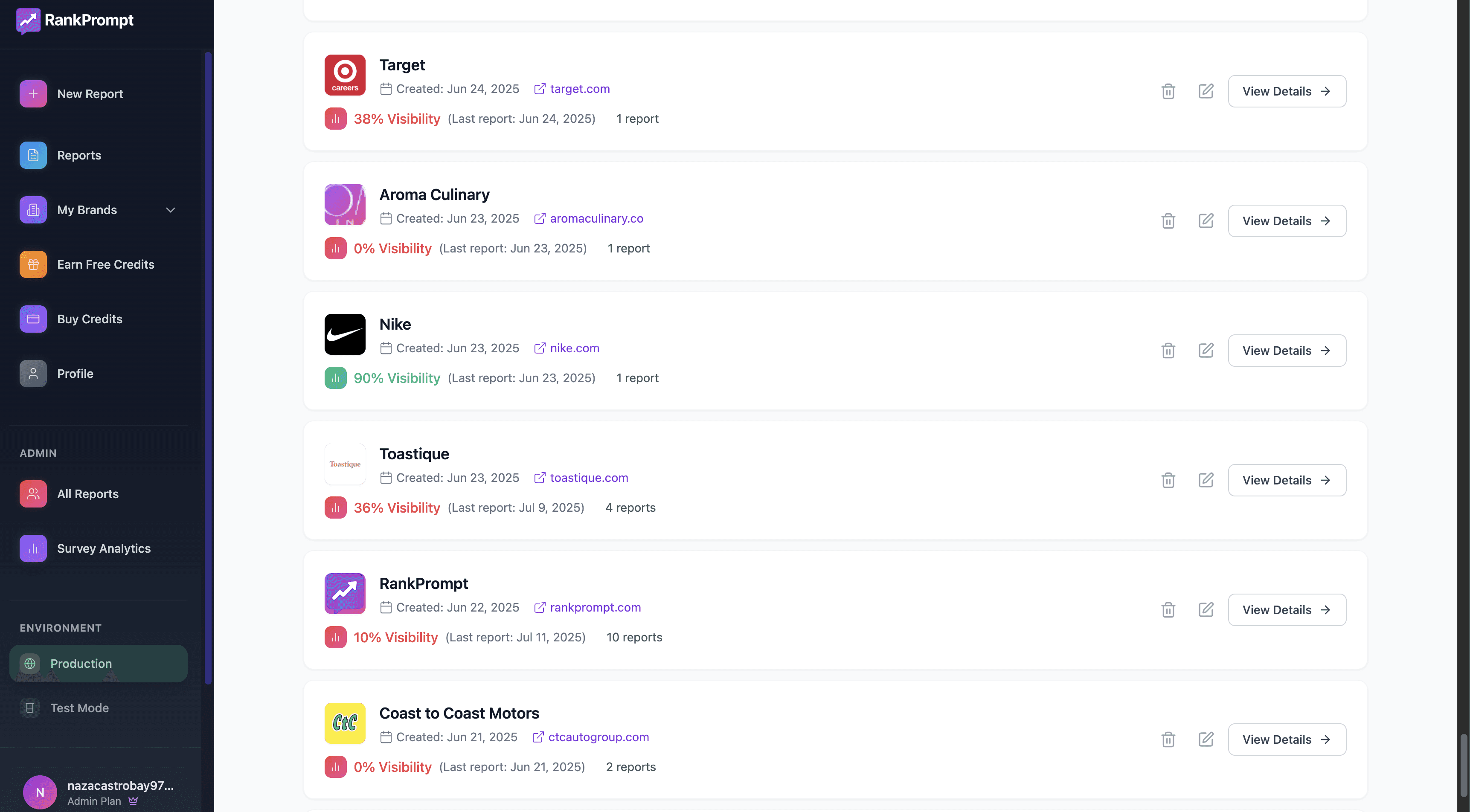 If reports are the engine of RankPrompt, your Brand Dashboard is the cockpit where you control and monitor everything related to your brand.