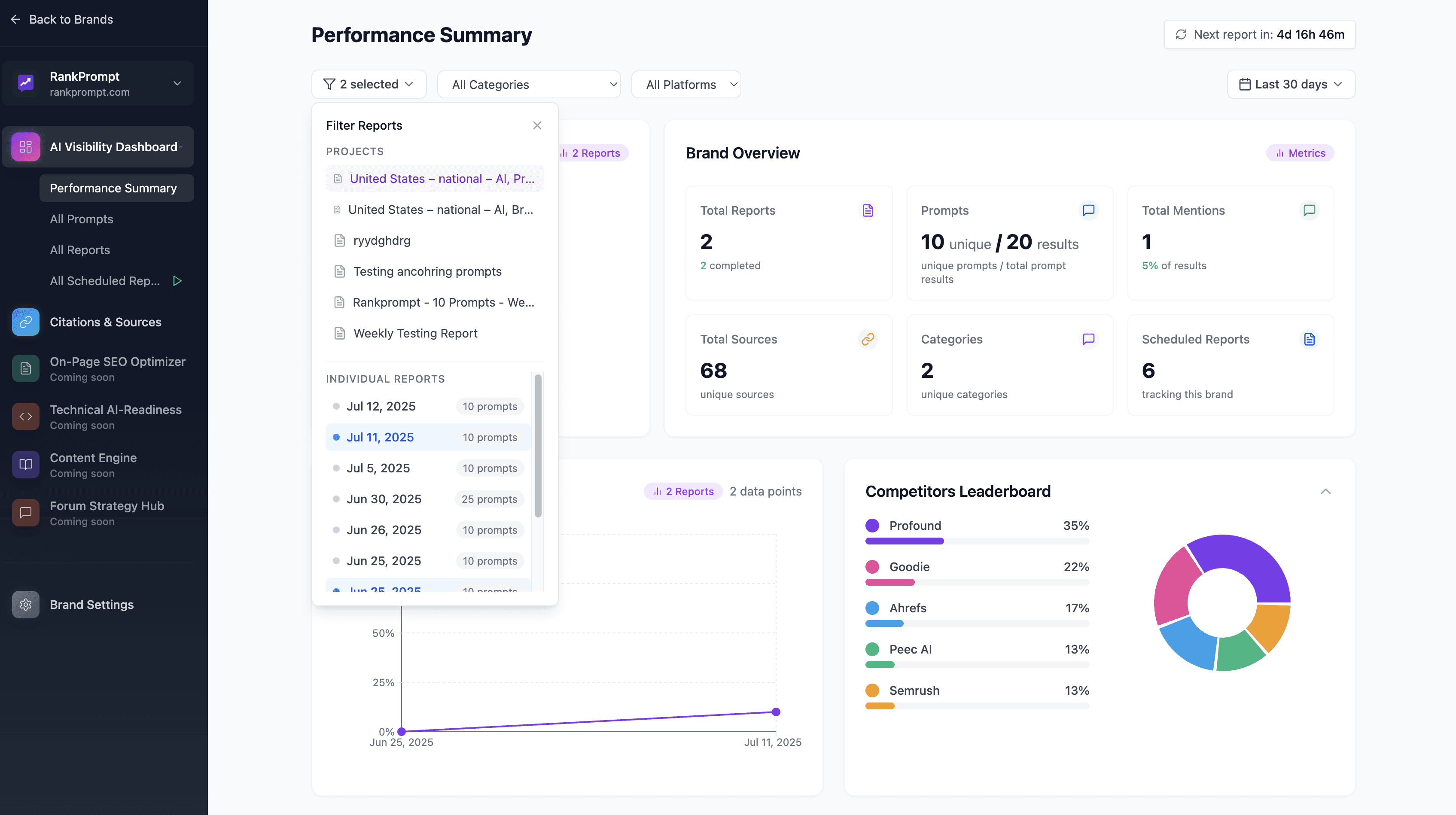 Scheduled reports help you monitor progress, spot trends, and react faster as things change across platforms like ChatGPT, Perplexity, and Google AI Overviews.