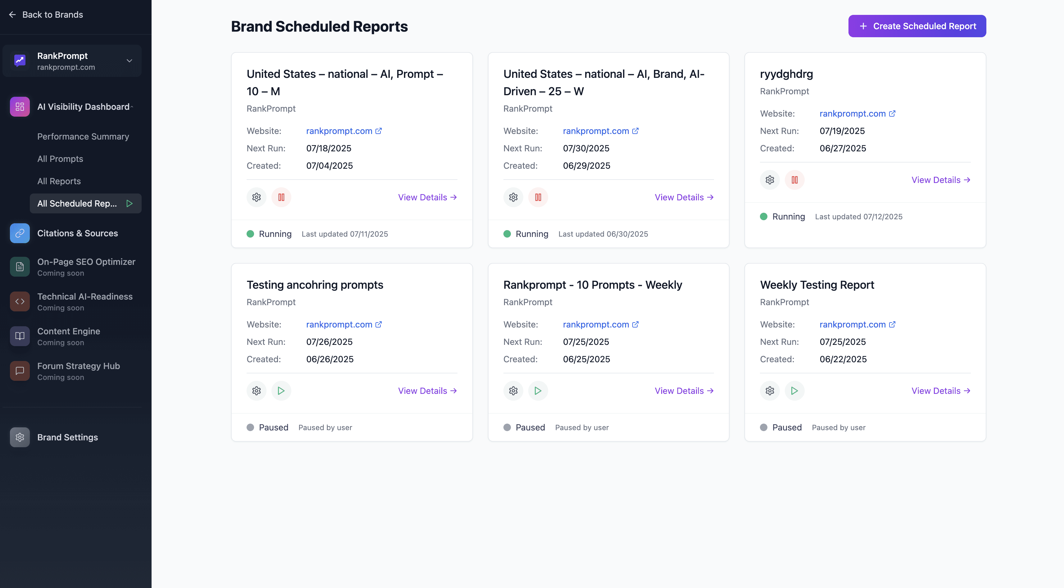 Pro Tip: Use Scheduling to Build AI Visibility Over TimeStart with small reports (focused on key prompts).