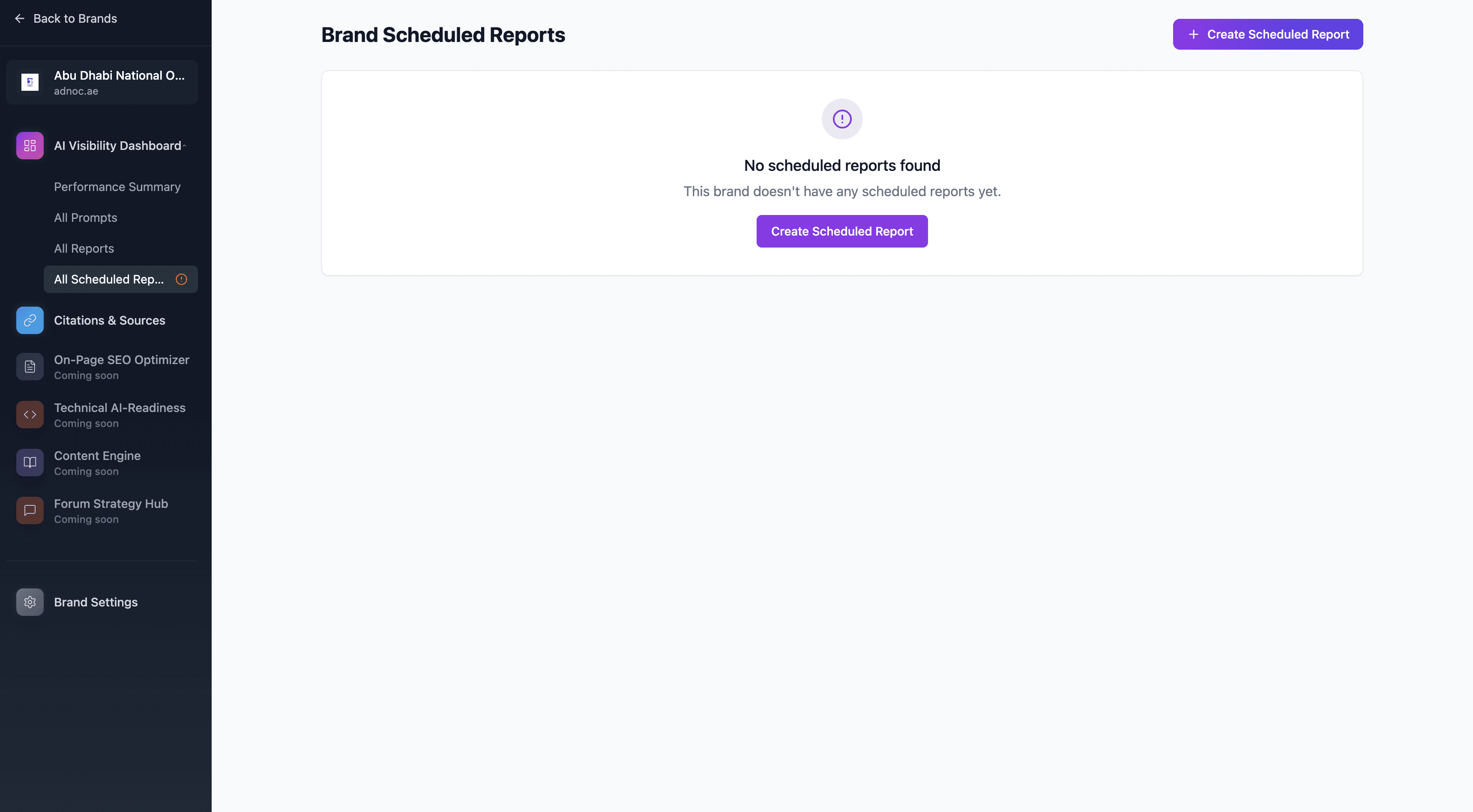 Go to “Scheduled Reports” TabInside the selected Brand’s dashboard, click on the “Scheduled Reports” tab.