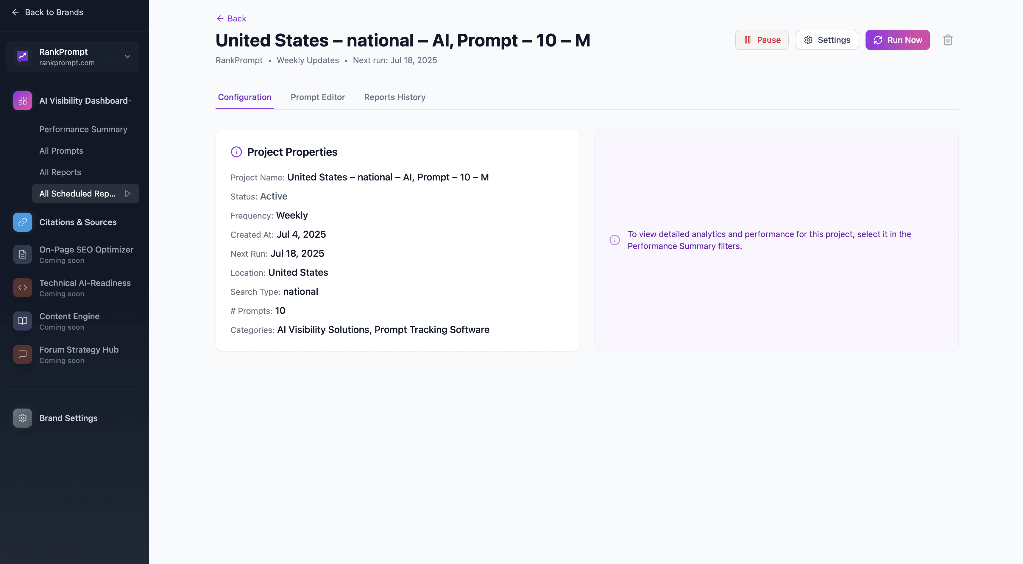 From now on, RankPrompt will automatically run this report at the selected frequency, deducting credits based on the number of prompts.